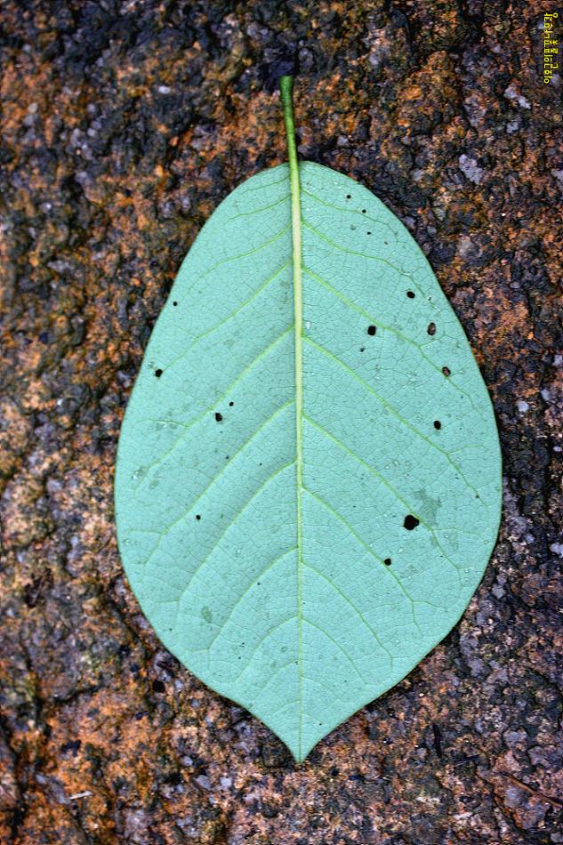 잎 어긋나며 길이 6-15cm의 타원형-넓은 도란형이다. 끝은 급히 뾰족해지며 가장자리가 밋밋하다. 뒷면은 회녹색이며 맥 위에 털이 있다. 잎자루는 길이 1-2cm이다.