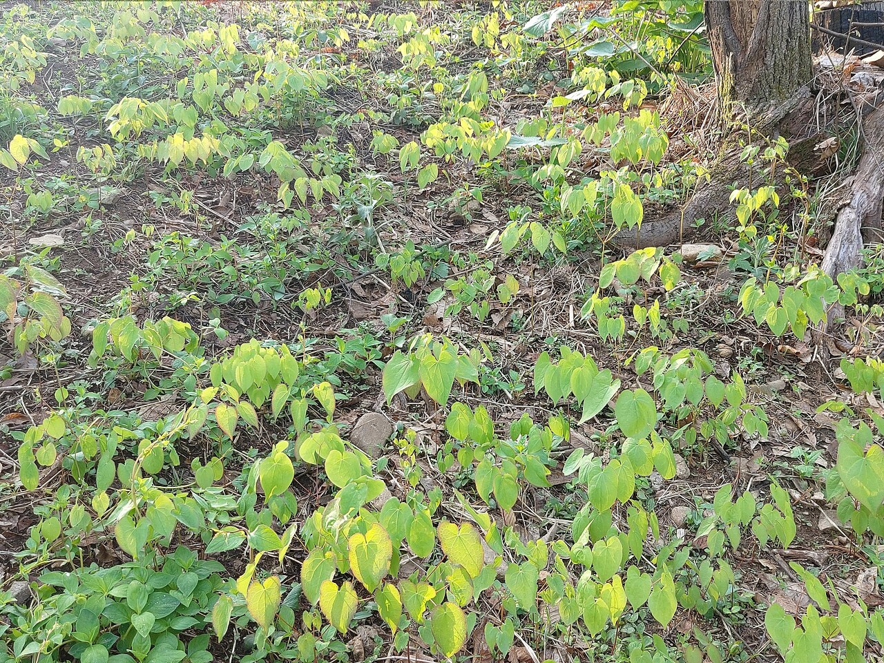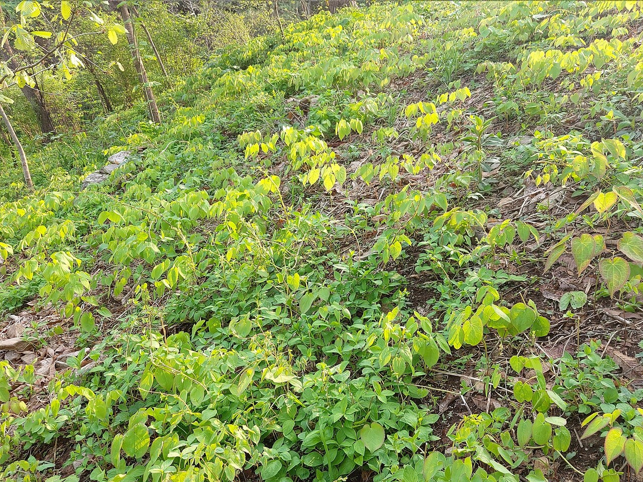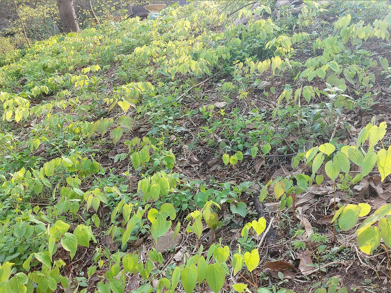 밀식하여 자연림 숲 에 삼지구엽초 뿌리 이식 후