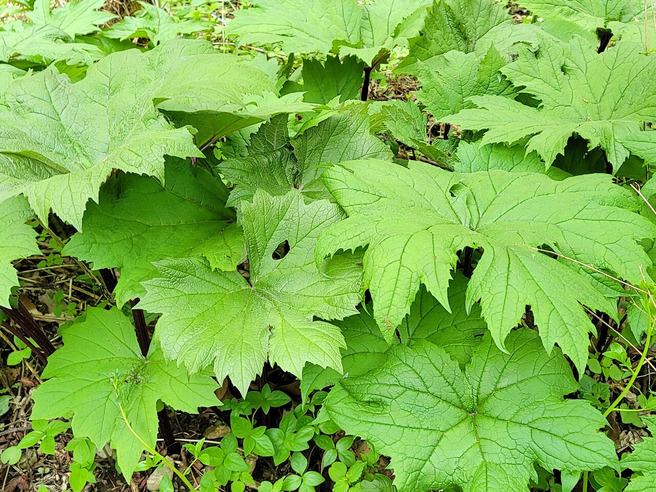 왼쪽 홍풍취, 잎 뒷면 잎맥까지 붉게 물들어 있다 - 오른쪽 푸른 대궁의 병풍취