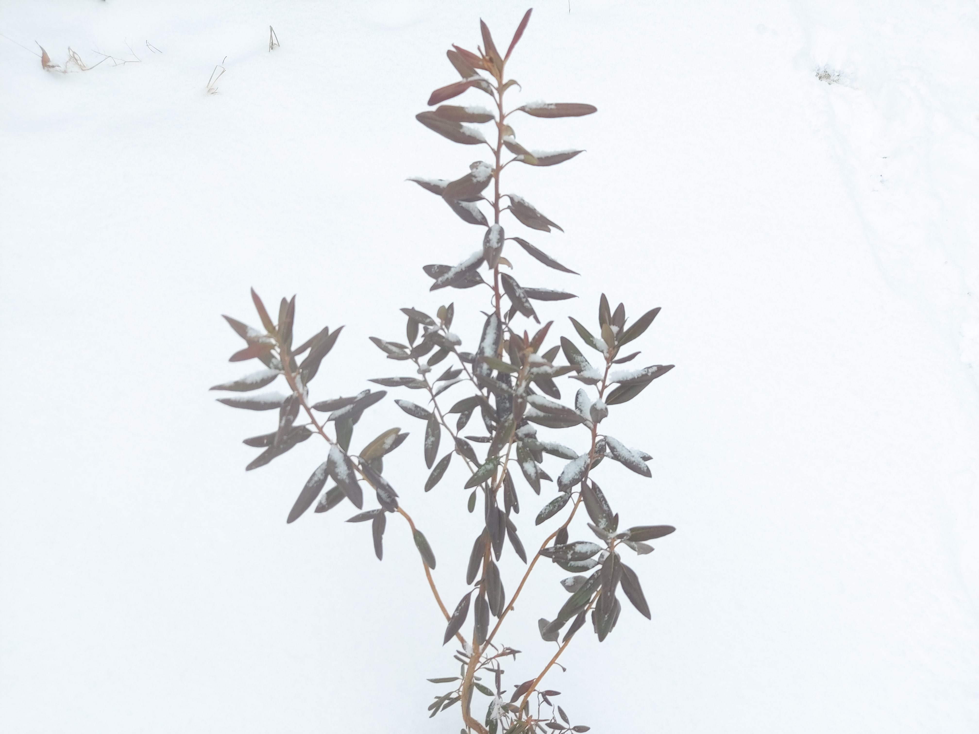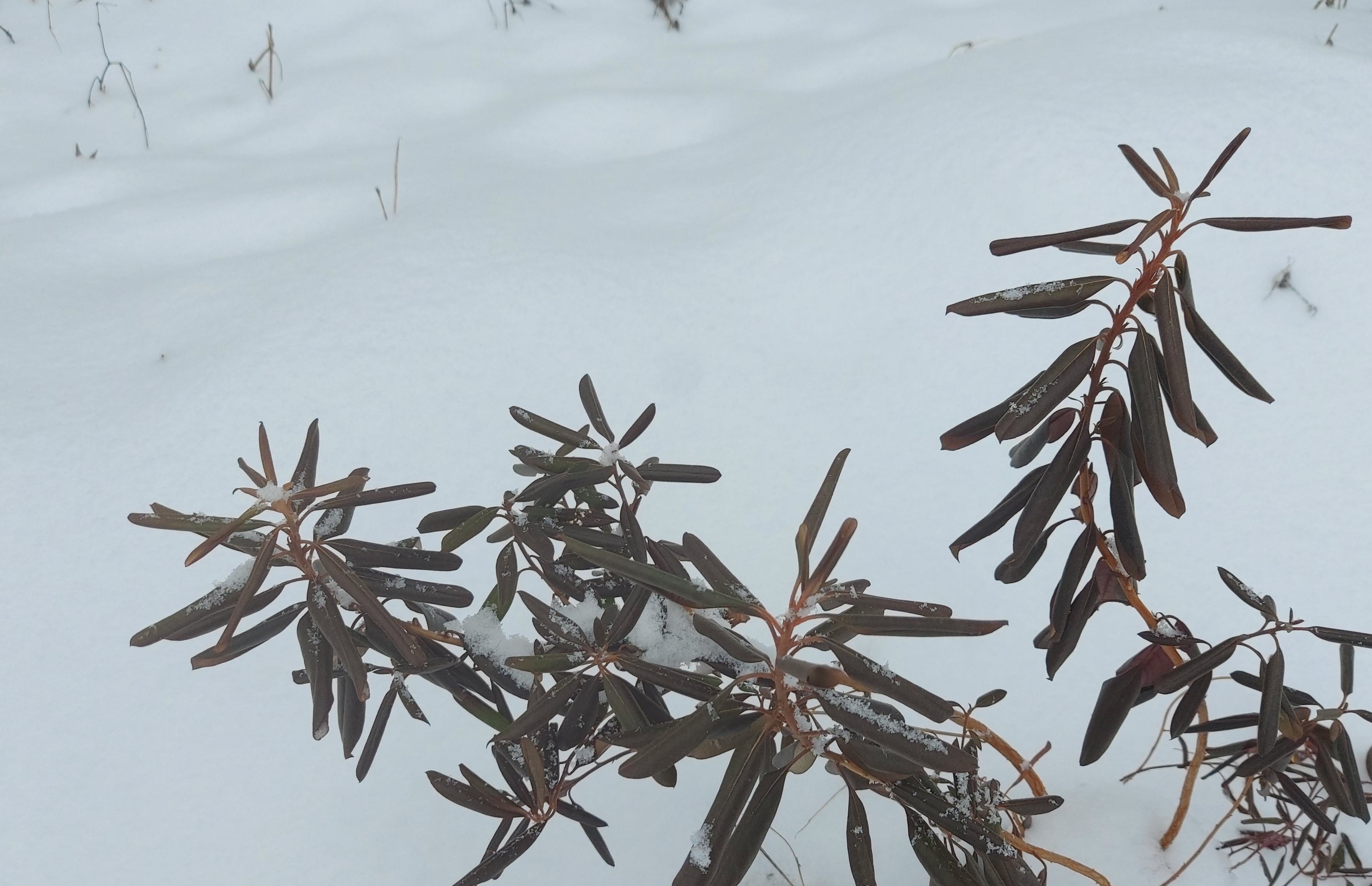 네살박이 꼬리진달래 묘목 한겨울 - 햇볕이 나면 오그라들었던 잎이 활짝 펴진다.