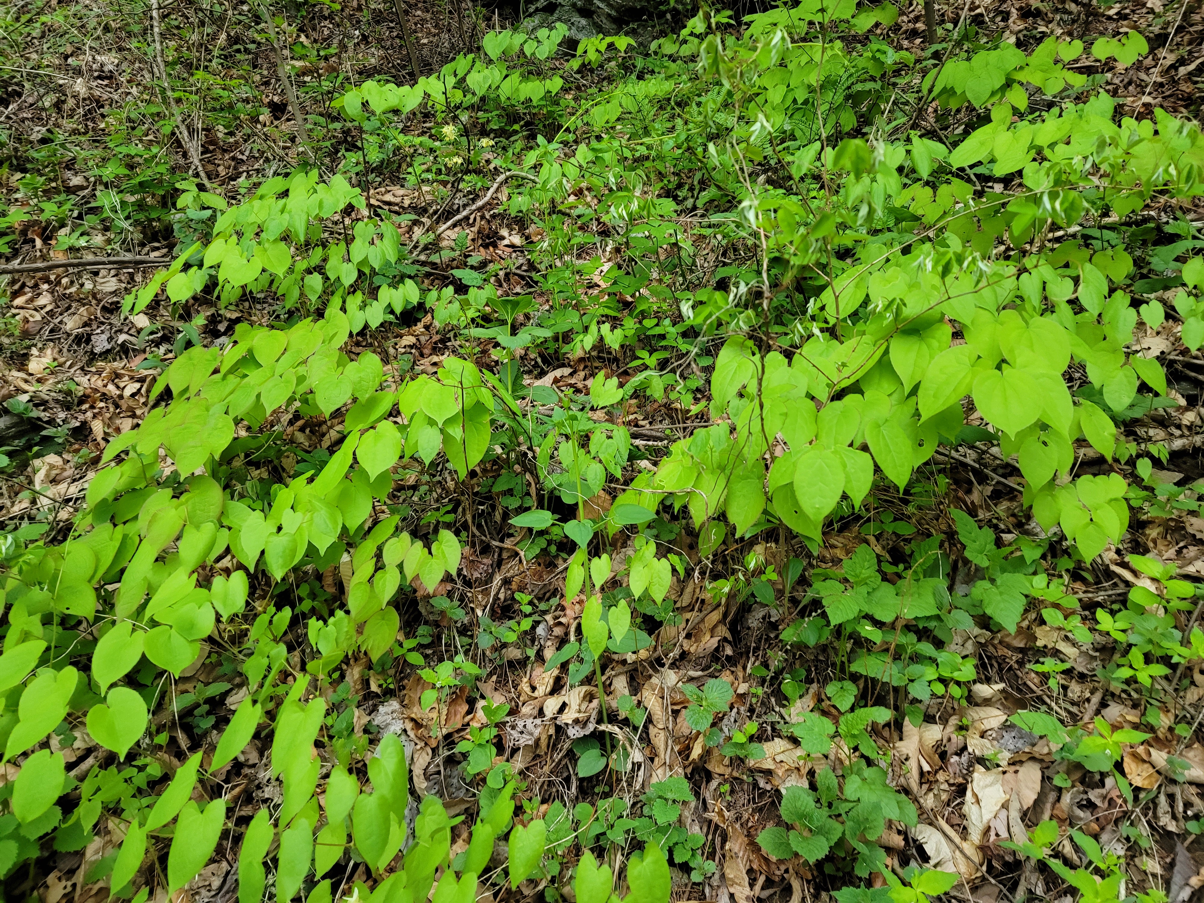 자연림 숲 삼지구엽초 야생 자연재배지 - 삼지구엽초 번식용 뿌리 이식 직후 이른 봄